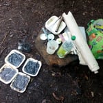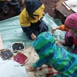 Schwarz aus Asche, braun aus Waldboden, rot aus Begonien und Hagenbuttentee und orange aus Tagetes. Wir haben die Farben mit Kleister oder Maizena verdickt, die Pflanzensäfte mussten erst aufgekocht werden. Unser rot sah beinahe ein bisschen wie Ketchup aus.